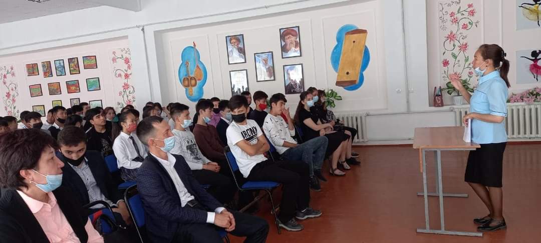 Кездесуге № 9 Меркі колледжінің кәсіптік бағдар беру тобы Ш.Ауесханова, Э.Аденова, А.Сауранов , А.Шайменова мен мектептің 9 сынып оқушылары қатысты.